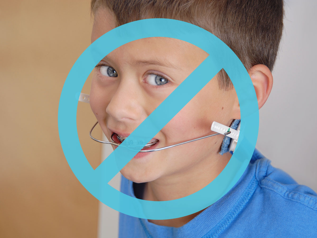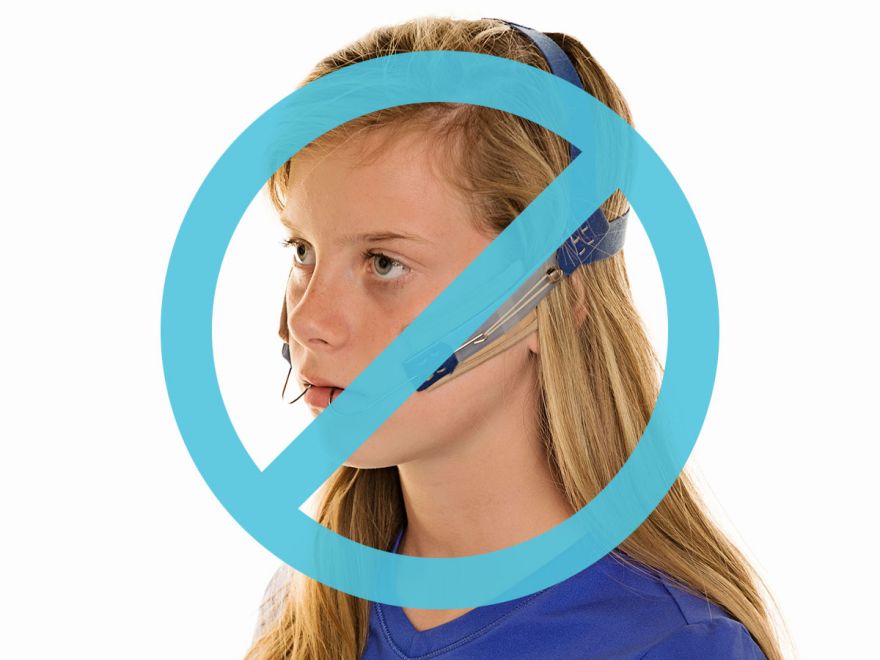 Die Aussenzahnspange der sogenannte Headgear besteht aus einem inneren und äusseren Metallbügel und einer Kopfkappe bzw. einem Nackenzug. Der äussere Bügel mit dem Zug liegt ausserhalb des Mundes und ist von aussen gut sichtbar, weshalb er auch Aussenbogen genannt wird. Die tägliche Tragezeit des Headgears liegt bei ca. 14-16 h und bewirkt bei guter Tragzeit, dass die Stockzähne u.a. nach hinten verlagert werden.